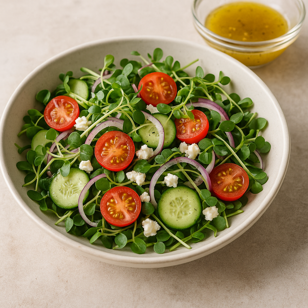 In a large bowl, combine the ChefPax microgreens, cherry tomatoes, cucumber, red onion, and feta cheese.